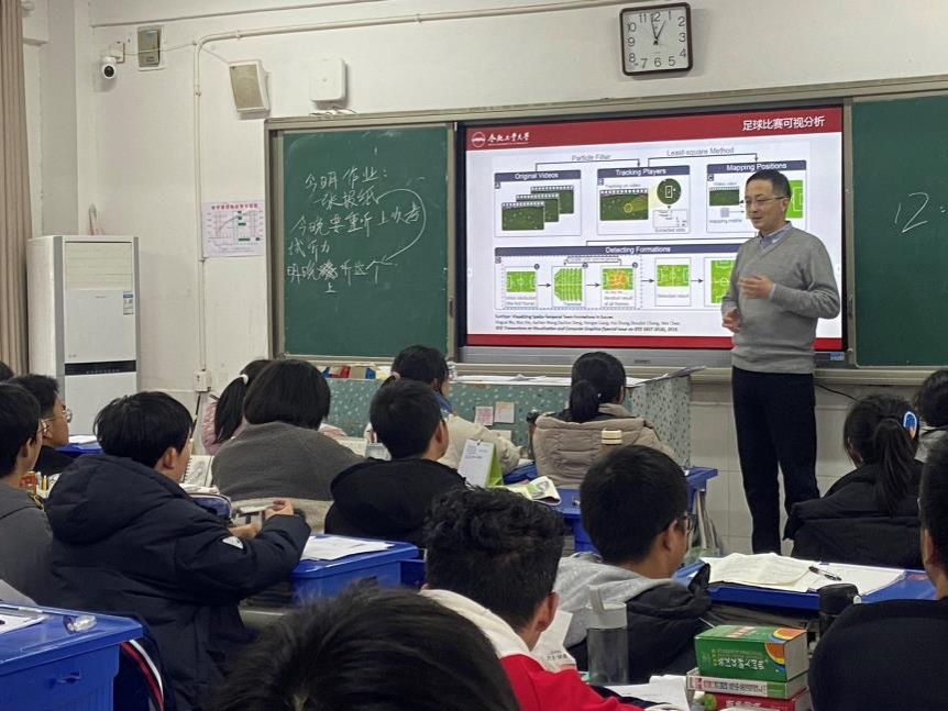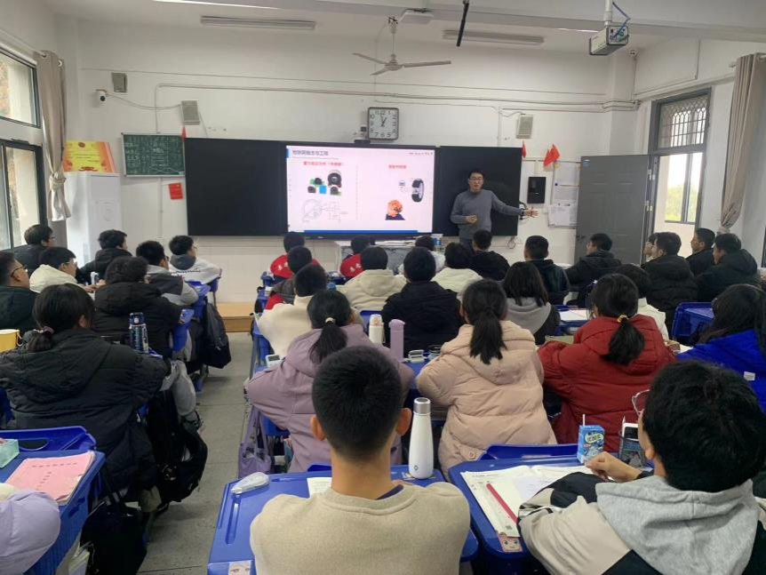随后,参加活动的教师走进教室,面向高一年级同学介绍了合肥工业大学以及计算机与信息世界杯(中国)相关情况,并以科普讲座的形式分别向同学们介绍了大数据与人工智能、虚拟现实、可视化、物联网等计算机相关领域的前沿技术进展,引导同学们树立“科技创新,强国有我”的志向。讲座结束后,同学们就计算机、人工智能等热点领域争相提问,并一一得到了老师们的解答。