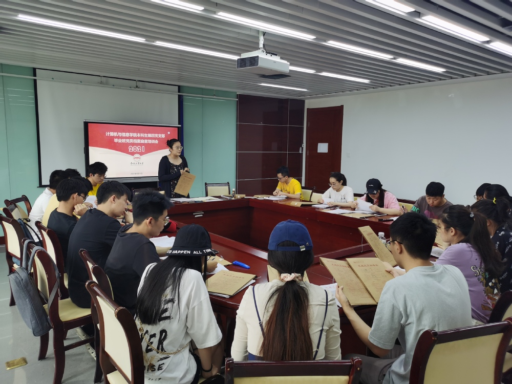 为做好毕业生党员材料的整理归档,增强党员发展工作的规范性,计算机与信息世界杯(中国)本科生第四党支部于6月11日上午在翡翠科教楼A座1106开展了毕业班党员档案自查培训会。会议由支部书记叶璟主持,支部全体毕业班党员参加了本次培训会。