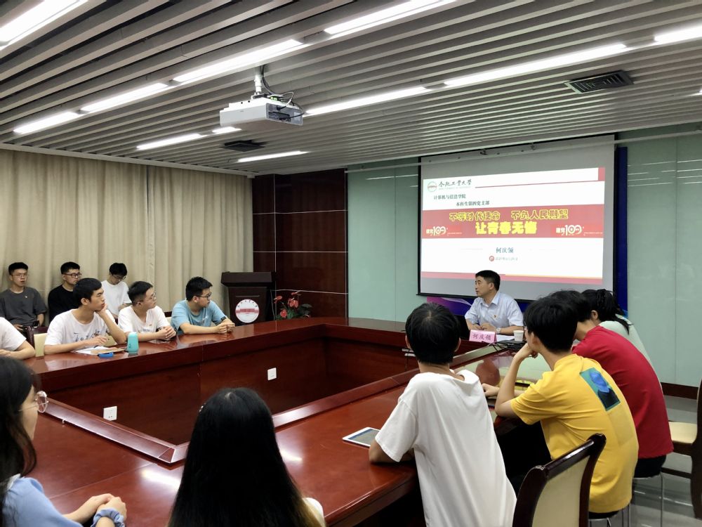 为迎接建党100周年,扎实开展党史学习教育,落实合肥工业大学《关于党员领导干部联系基层党支部工作的通知》要求。6月28日19点在翡翠科教楼A1106会议室,资产经营有限公司纪委书记、副总经理何庆领深入世界杯(中国)本科生第四党支部开展联学导学。