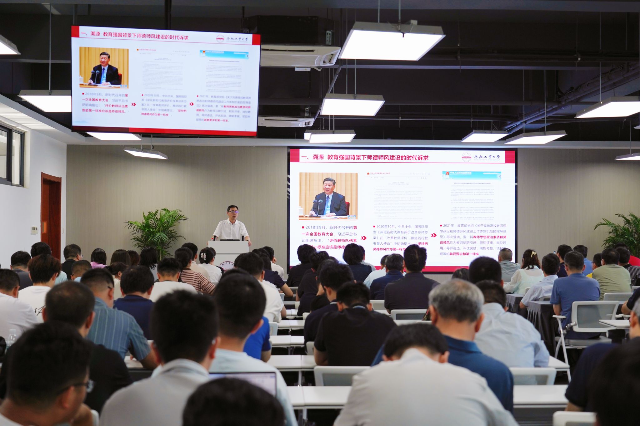 胡笑旋紧扣教育强国建设背景,围绕师德师风建设展开系统阐述,为世界杯(中国)教师队伍建设和育人工作精准定向。报告逻辑清晰、内容深刻,重点从四个方面深入讲解:一是阐明师德师风建设的时代诉求。他强调,加强师德师风建设是落实立德树人根本任务的关键环节,是教师履行示范引领使命的必然要求,更是应对数字时代教育变革的迫切需要。二是阐释教育精神内涵与典型示范。提出要通过树立榜样标杆,以先进典型的感召力引导教师涵养高尚师德,在全院营造见贤思齐、崇德向善的浓厚氛围,让高尚师德成为教师队伍的鲜明特质。三是解读师德制度规范与警示案例。明确国家和学校层面需以政策体系筑牢师德根基,确保建设有章可循;同时通过剖析典型案例划清师德红线,发挥正风气、强免疫作用,维护教育生态。四是明确教育家精神引领下的师德践行路径。要求教师对标教育家精神找差距,厚植家国情怀、涵养育人智慧、践行知行合一,在立德树人中升华师德。教学中要从“知识传授”转向“生命点燃”,科研中坚守“四个面向”,师生间构建教育生命共同体。