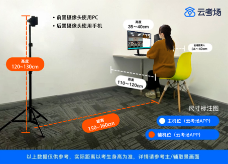 网络远程面试主设备,需要正向面对考生,复试全程开启,摄像头正对考生。复试过程中,要求视频中考生双手和头部全程在视频录像范围。网络远程面试监考及备用设备,摆放在考生侧后方(与考生后背面成45°角),能够全程拍摄考生本人和电脑屏幕,复试全程开启。