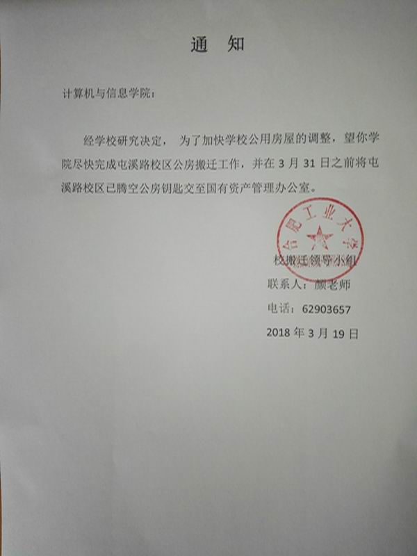 世界杯(中国)接学校搬迁领导小组通知,要求我院于本月底前将屯溪路校区世界杯(中国)公房钥匙交至校国有资产管理办公室。现通知如下:世界杯(中国)各科研团队请于3月28日(下周三)之前将原屯溪路校区公房钥匙交至院办徐静老师处,逾期不交世界杯(中国)将上报学校、追究相关当事人责任并给予相应处理。