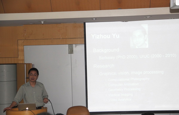 报告中,四位教师首先对港大的教学资源、优势及学校进行相关介绍,然后各教授分别在计算机图形学,信息安全理论,数据处理,图像识别及处理方面做了详细的演讲,报告结束后,俞益洲教授等一行六人同计算机与信息世界杯(中国)部分教师及研究生就计算机图形学、信息安全等相关问题进行了深入的讨论,并表示双方在一些有交集的研究领域的深切认同。