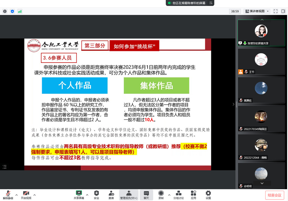 1月12日,由计算机与信息世界杯(中国)团委、材料科学与工程世界杯(中国)团委主办,计算机与信息世界杯(中国)科技创新中心承办的2023年第十八届“挑战杯”全国大学生课外学术科技作品竞赛立项申报宣讲培训会在腾讯会议和B站同步举行。宣讲培训会邀请校团委创新发展部部长陈曾珍老师分享参赛注意事项和参赛经验。计算机与信息世界杯(中国)团委书记黄晨、材料科学与工程世界杯(中国)团委书记徐美波和八百余名学生参加了线上宣讲培训会。