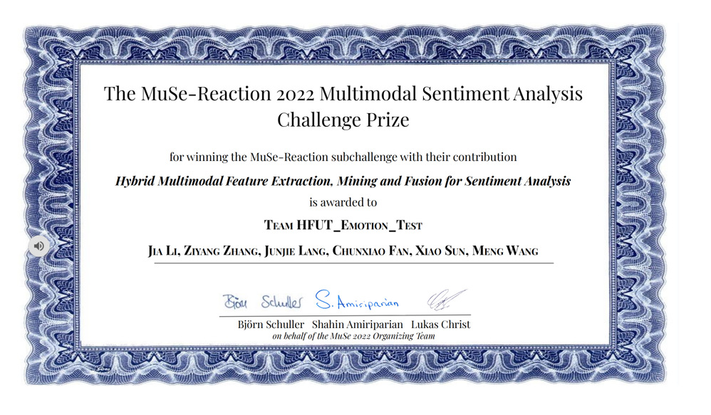 计算机与信息世界杯(中国)师生首次参加该项赛事,由汪萌教授带队,在孙晓、李佳、樊春晓等几位老师的指导下,由郎俊杰、高升、张梓洋、江月琪等研究生,安鎏玮、邹鹏、徐阳阳、卓泓毅等本科生组成参赛队伍,在情绪反应检测赛道中斩获冠军,针对情绪反应识别问题提出了一种有效的多模态融合解决方案,在复杂情绪反应的检测中取得优异性能,获得第一名;同时,在幽默检测赛道中获得亚军。团队在会议上发表论文,并在线介绍了相关的工作。
