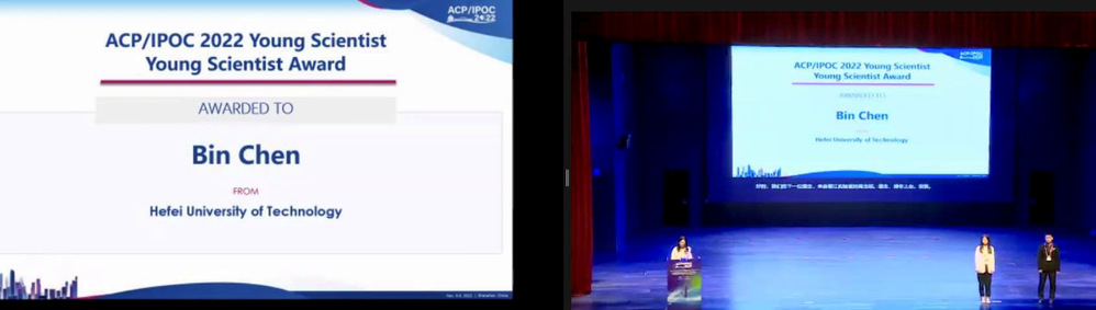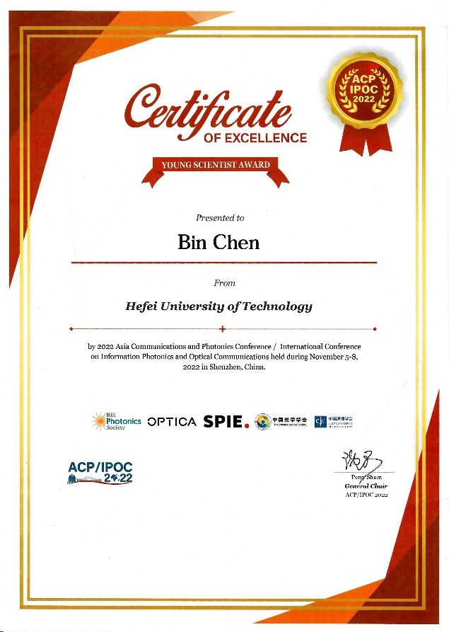 本次大会设置了青年科学家奖、最佳论文奖、最佳海报奖等多项奖项。我院陈斌副教授从数十位申请人中脱颖而出,荣获“ACP/IPOC 2022青年科学家奖”。该奖项旨在表彰光通信、光子学领域40岁以下优秀青年学者,经国际知名专家组成的评委会评选,本届共设4人,另外三名学者分别来自北京邮电大学、南方科技大学、之江实验室。