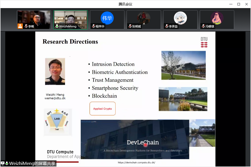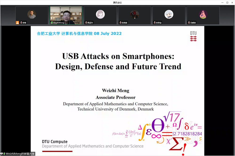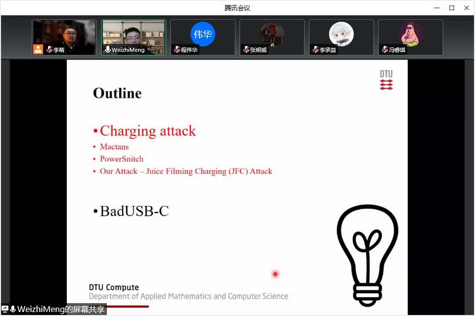 在报告会上,Meng博士介绍了哥本哈根、丹麦科技大学和应用数学与计算机科学世界杯(中国)的基本情况,也介绍了其团队的最新科研成果,包括手机充电攻击和BadUSB-C攻击。Meng博士也对当前智能手机安全的主要挑战和公开问题进行了讨论。在报告会结束后,线上师生和Meng教授进行了深入交流。
