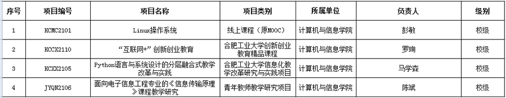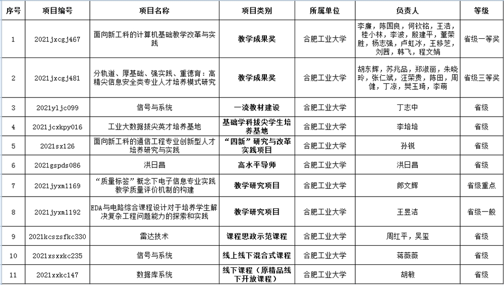 近日,安徽省教育厅公布了2021年度高等学校省级质量工程项目立项名单。我院有11个项目获批省级立项(见表1),同时我院有4个教学质量与教改项目获校级立项(见表2)。在此,向荣获2021年度教学成果奖和质量工程项目的老师们表示祝贺!