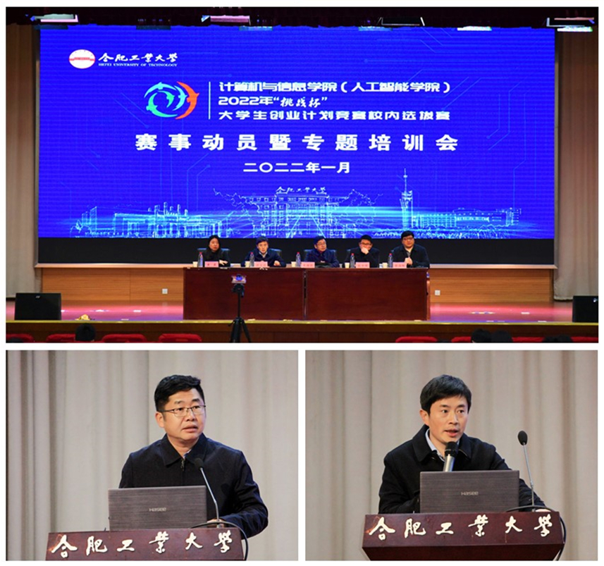 1月5日下午,计算机与信息世界杯(中国)(人工智能世界杯(中国))2022年“挑战杯”中国大学生创业计划竞赛动员宣讲暨专题培训会在翡翠湖校区科教楼大报告厅举行。活动邀请安徽启迪新基建战略合作部副总经理张平辉进行专题培训。校团委书记武国剑、该院常务副院长洪日昌、党委副书记兼纪委书记张海林、团委书记黄晨及各年级班主任出席会议。现场参与学生涵盖本科生、研究生,累计五百余人,同时依托“计算机小喇叭”B站平台开通线上直播,累计有2773人在线观看。会议由党委副书记张海林主持。