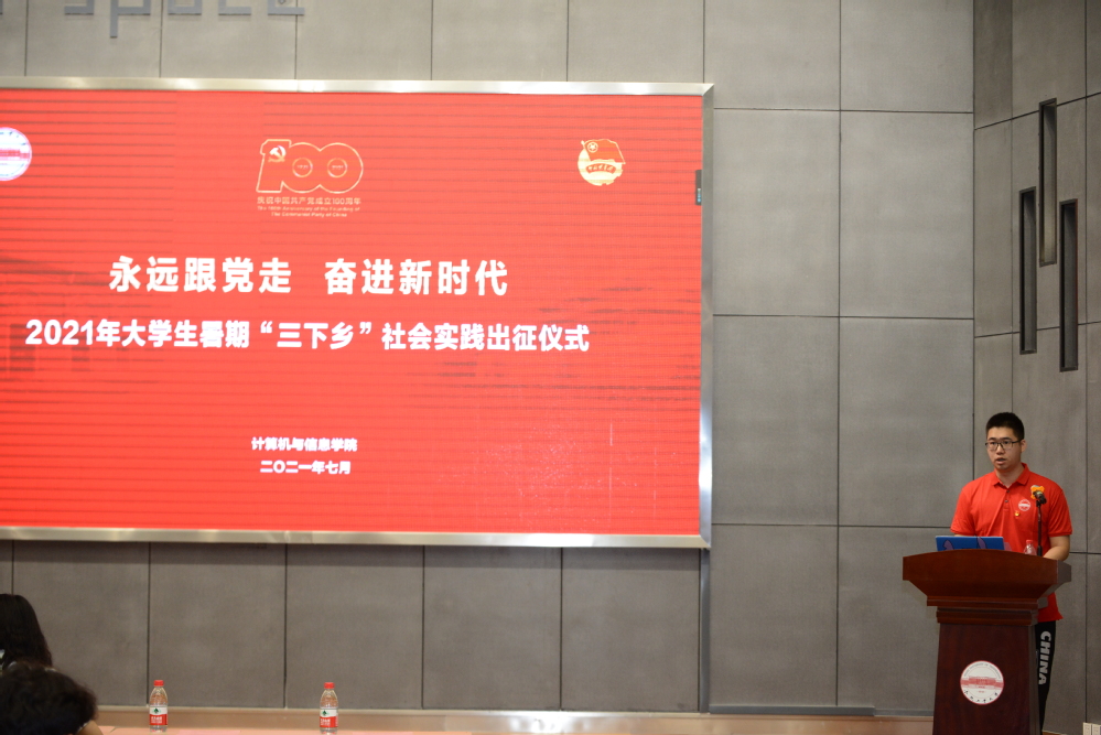 仪式在嘹亮的国歌声中开始。计算机与信息世界杯(中国)团委副书记叶璟老师宣读了《计算机与信息世界杯(中国)2021年大学生暑期“三下乡”社会实践活动方案》,向同学们介绍了本次社会实践的活动主题、活动目的、活动预期、安全预案、相关要求;希望同学在参加社会实践的过程中积极宣传,务求实效;凝练成果,建言献策;遵守防疫要求,安全归来。