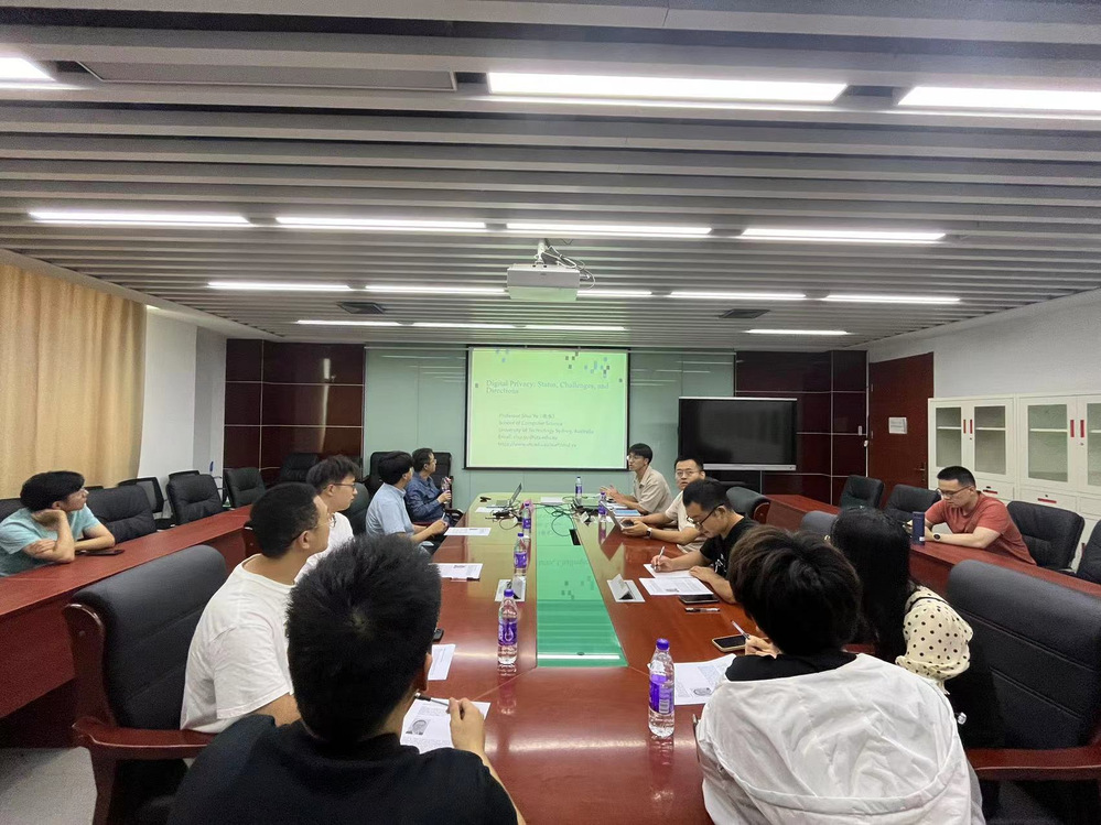 会上,余水教授简要介绍了悉尼科技大学,并就其团队目前的研究方向与我院师生进行了分享与深入探讨,包括Privacy Pricing、Machine Unlearning、Semantic Communication等当前AI安全研究的热点和难点问题。分享结束后,王垚飞老师、胡文波老师和刁云峰老师分别代表团队向余水教授介绍了我院目前从事的AI安全和信息安全方向的研究工作进展,并针对数据隐私保护、对抗安全、大模型的AI安全、可解释的AI安全以及安全领域相关研究的落地问题进行了热烈讨论。