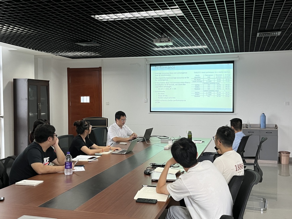 在报告会上,石怡副教授分享了其研究团队的最新科研成果,首先介绍了分布式频谱感知、去中心化联邦学习,展示了不同网络结构对于去中心化联邦学习效果影响。在这一基础上,重点介绍对于分布式频谱感知去中心化联邦学习的干扰攻击,包括可能存在的干扰攻击手段以及攻击效果。报告会后,石怡副教授和与会师生讨论了去中心化联邦学习研究成果的相关细节问题,解答了同学们的疑惑。