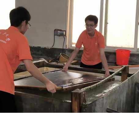 沐师傅详细地为合肥工业大学的师生介绍原料制备车间、打浆车间、抄纸车间、晾晒车间、剪切车间的生产工艺和技术细节。在参观过程中,工人们井然有序、默契合作,在各种工作环境下仍能专注工作。工厂内配备有高度自动化的机械设备,同时还保留了采用传统工艺的宣纸制造工坊。工厂内工作环境整洁,污水处理设施齐全。实践团队亲身体验了古法宣纸的制造和宣纸的裁剪工艺,不仅收获了宣纸制造的知识,更切身体验了宣纸制造的艰辛和不易。