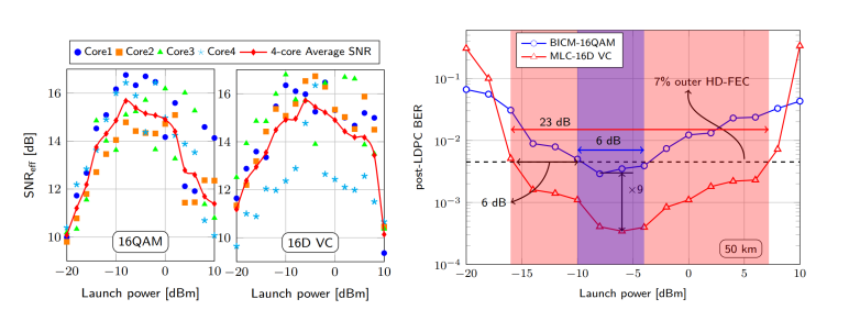 我院师生本次获得的高分论文“Experimental Demonstration of 16D Voronoi Constellation with Two-Level Coding over 50km four-Core Fiber”,针对未来基于多芯光纤技术的扩容优势和挑战,提出了一种基于16维联合编码调制(MLC-16DVC)的多芯光纤传输方法(如图1所示)。经过单跨50公里四芯光纤传输实验验证(传输实验系统如图2所示),相较于传统的二维独立QAM调制,所提出方法可以容忍更大的芯间信噪比差异影响,并在外级联硬判决纠错容限处可提供6dB的光功率增益(如图3所示)。