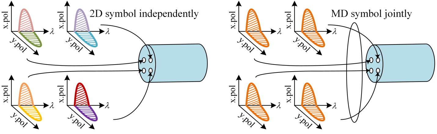 图1:四芯光纤传输系统中传统二维调制和多维调制对比示意图