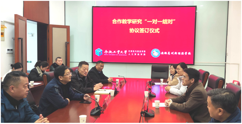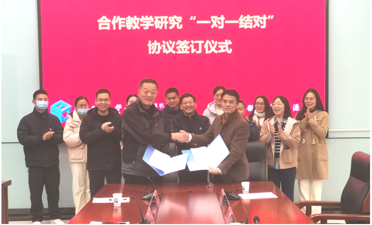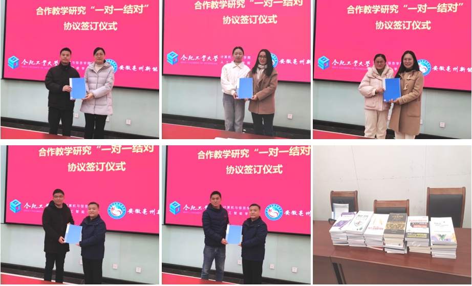 随后,我院与新能源学校进行了合作教学研究“一对一结对”签约仪式。现场,双方学校的5对教师“牵手”成功(图3),他们将在接下来的6个月里,合作开展教学、科学研究,形成一定的研究成果,并进行成果的合作发表,另外,我方教师还将协助对方进行学历提升的各项准备工作,包括考研的复习和备考。仪式最后,还进行了计算机类优秀图书的捐赠。