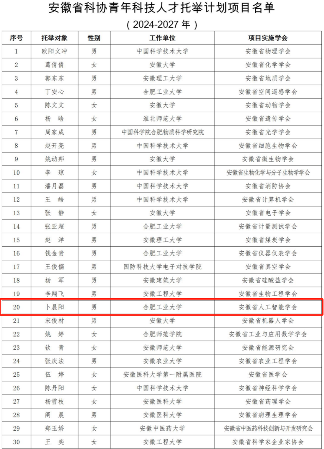Recently, the Anhui Provincial Association for Science and Technology (Anhui Provincial AST) announced the list of recipients for the 2024-2027 "Anhui Provincial AST Young Scientific Talent Support Program." Associate Professor Bu Chenyang from the School of Computer Science and Information Engineering has successfully been selected.